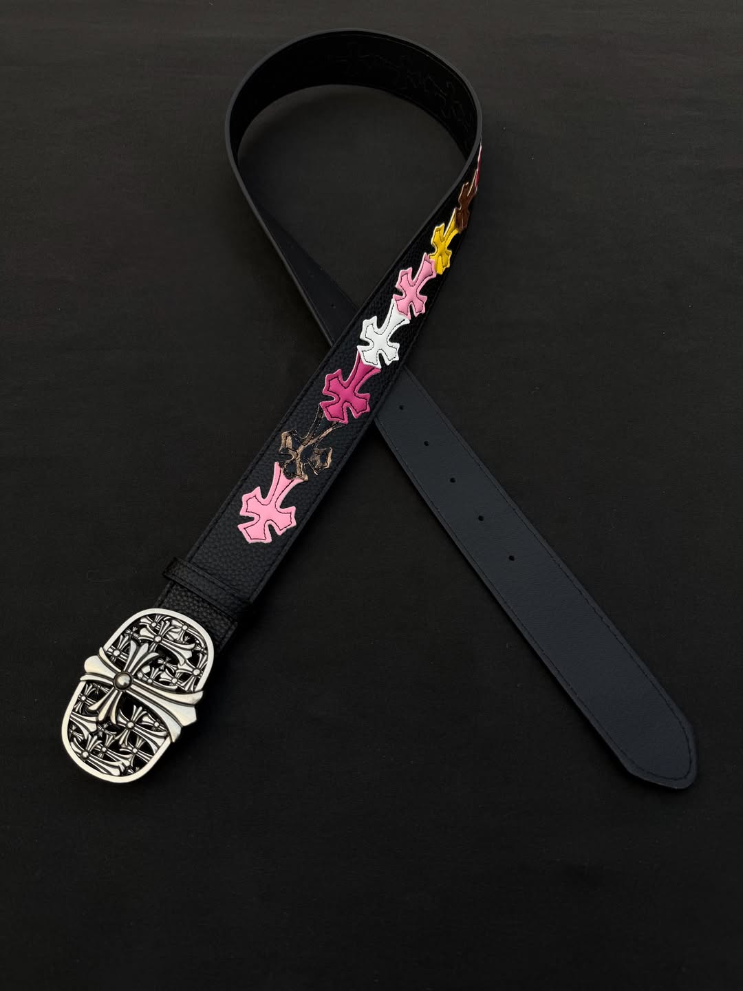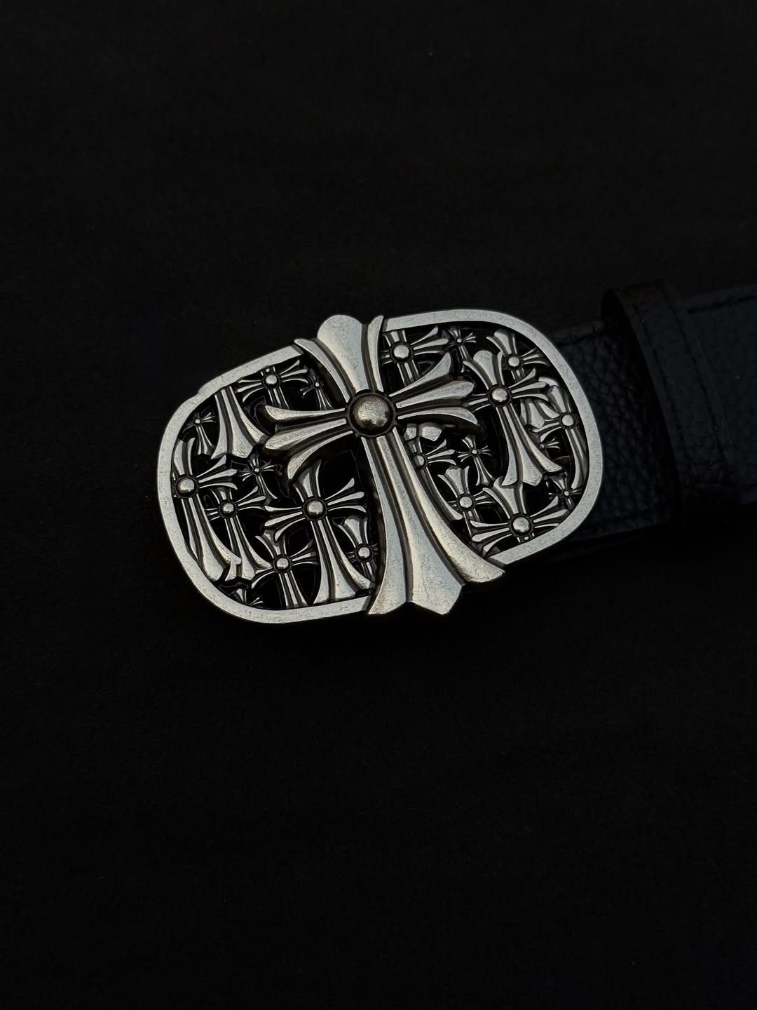 - Signature buckle: Heavy, shiny chrome buckle with detailed cross artwork.